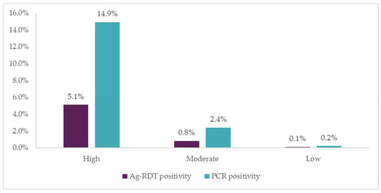 SARS-CoV-2 positivity rate for Ag-RDT and PCR tests by risk group.