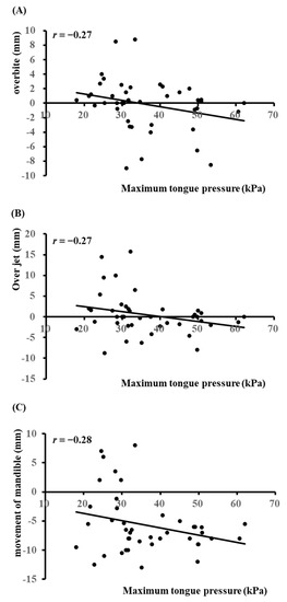 Linear regression analysis between maximum tongue pressure and overbite (A), overjet (B), and movement of the mandible (C).