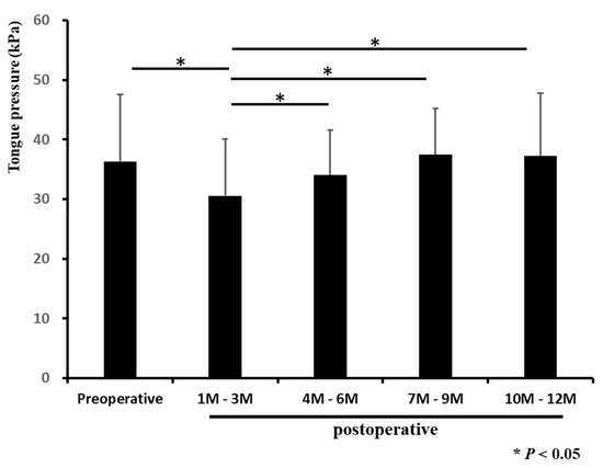 Changes in maximum tongue pressure before and after surgery. MTP was measured before and one year after surgery. The MTP at three months after the operation was significantly lower than that in other periods. Each bar represents the mean ± SD. * p < 0.05.
