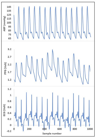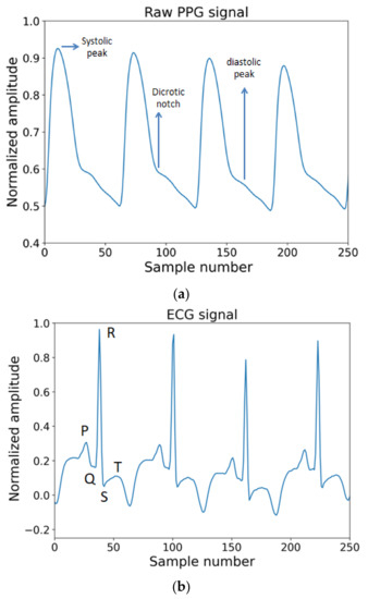 The most commonly known reason behind hypertension is a build-up of plaque in arterial walls and a decrease in the elasticity as well as the radius of arteries requiring more force from the heart to pump blood and higher pressure on the vessel wall. This plaque build-up impacts patients’ health in two ways. First, it progressively worsens the health condition by obstructing blood flow to different important organs of the body and second, it brings significant cardiovascular disorders. This knowledge guided us to choose appropriate vital signs which reflect changes in blood pressure. As explained in what follows, the ECG and PPG waves are the proper biomedical signals to be used to perform cuffless BP measurements. Consider Figure 2a,b, where PPG and ECG waves are shown.