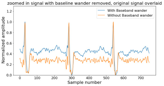 Contamination comes in the ECG wave from noise and artifacts, and the goal of pre-processing step is to reduce them as much as possible keeping the integrity of the original signal [79]. The noise and artifacts are power line interference (50–60 Hz), base-band wanders (around 0.3 Hz), power line interference, motion artifacts, and noise from nearby electronic devices, etc. The pre-processing stage starts with a filtering block to delete the artifacts from the ECG signal [80]. An example of noisy and noise-free ECG signals is depicted in Figure 3. Typically, a band stop filter and an FIR filter of order 50 is sufficient to get rid of noise with cut-off frequencies of 0.5 Hz and 100 Hz [81]. The output of the FIR filter is being passed through a moving average filter to smooth the signal and remove the unusual momentary spike. Unlike the low pass filter, the high pass filter does not attenuate much of the signal but suffers from phase shifts [82]. The high pass filter removes the DC offset which comes from electrode/gel/body interference and is used to remove the baseband wanderer.