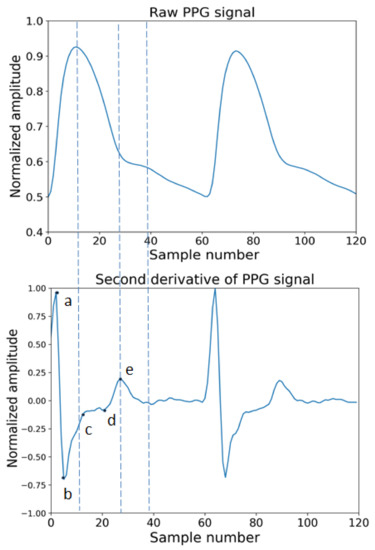 The derivatives of PPG waves are very useful for interpreting original PPG signals. In Figure 5, the original and the first derivative and Figure 6 shows a PPG signal and its second derivative. In Figure 5, the significant points in the first derivative were shown as ΔT and crest time (CT). The ΔT is the time interval between the first derivatives of PPG where the signal is going to zero from a positive direction to negative directions. The CT is defined as the time interval from the minimum of the PPG wave to its maximum peak. ΔT and CT are closely related to any abnormality related to a heart condition [85]. In Figure 6, the significant points are shown as points a, b, c, d, e. According to a previous study, the ratios, such as b/a, c/a, e/a, and (b-e)/a, etc., strongly related to the change in arterial stiffness [86]. The points a~e and the time interval between different points of ECG and PPG are used as features to measure blood pressure.