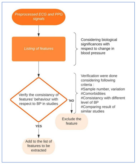 The whole process of finalizing the features to be extracted is shown in Figure 7. First, the morphological features from ECG will be discussed which are relevant to blood pressure measurement. The main challenge with ECG features is that the morphological changes in ECG for a hypertensive patient can either change for a short time period at the onset of high pressure or the change can sustain for a longer period [87]. The characteristics of the P wave from an ECG envelope, such as P wave area, amplitude, minimum duration, amount of dispersion, etc., have shown some relation with a change in blood pressure [88,89,90]. The length of PR interval increases with the increase of blood pressure [89,90,91,92]. The QT interval is the duration between Q waves until the end of the T wave, the characteristics which were found related to BP changes were: QT duration maximum, minimum, and QT dispersion [91]. The fragmented QRS complex is found more often with high blood pressure patients, also with a higher amplitude of the R and S wave. In the case of the T wave, the features are the same but the P wave was found to be related in some way to a change in blood pressure [90,93,94,95]. In previous studies, along with other discoveries, there were some shortcomings. For example, in some studies [91,92,94], the BMIs were not well spread out, some have patients mostly of a young age, some have limited patients with specific prior diagnosis, and several studies did not report any comorbidities or confounders, etc., [90,95]. These limitations require further study with these features before finalizing a specific list. Till today, there is no clear list of features from the ECG wave that are optimized in identifying hypertension reliably [96].