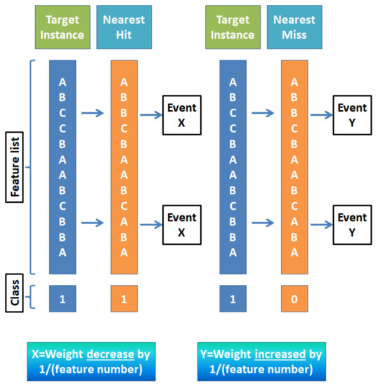The filter-based method relies on feature characteristics and is favorable for the model which requires quicker selection. The wrapper method uses a machine-learning algorithm to select the best features in the subset and it is more computationally extensive than the filter-based method [102]. The embedded method is an iterative approach that extracts features that contribute most to the training for a particular iteration. In our study, the filter-based approach was primarily selected based on the following reasons. Unlike the wrapper-based method, the filter method does not incorporate any machine learning model to determine the relevancy of any feature. The filter method is much faster compared to the wrapper method because they do not require any training phase, so with a larger dataset, the difference in computation becomes quite large. Unlike the wrapper method, the filter-based method does not depend on a heuristic search algorithm. In the hybrid approach, the combination of filter and wrapper does not integrate well which may result in lower classification accuracy [103]. Popular filter-based feature selection methods use different techniques to differentiate between relevant and irrelevant features. For example: Euclidean/Manhattan distances between feature variables project dependence or correlation within features as well as between feature and target variable. An example of using Euclidean distance between features is the relief algorithm [104]. To better understand the aforementioned “distance” feature, Figure 8 is provided to introduce what is a nearest ‘hit’ or ‘miss’.