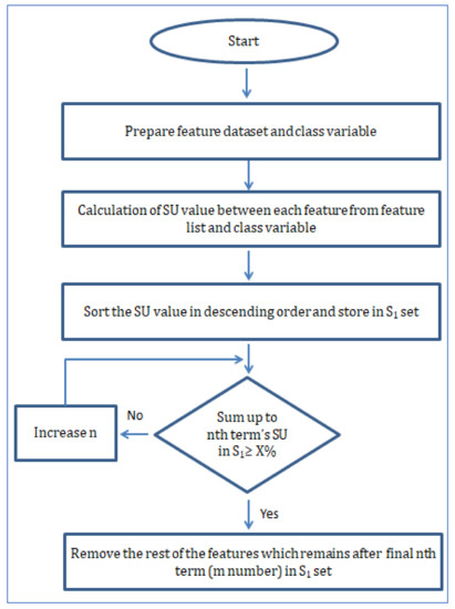 Here in Figure 9, the diagram of step 1 of the algorithm has been depicted. The majority of step 1 involves calculating SU values between features and class variables to make a ranking list. Based on the predefined high threshold, the selected features are put into a set called S1 as a collection of strong relevant features with class variables. Although the S1 set includes features that show a strong relation with the class variable at the same time, it does not confirm whether there are any redundant features present or not in set S1. For that purpose, step 2 of the algorithm is depicted in Figure 10. The main objective of step 2 is to remove redundant features from S1 and only keep the predominant features. When a feature that is ranked high in set S1 has a higher SU with the next feature in set S1 than the SU between the next feature and class variable, we can safely confirm the next feature as redundant. Using this principle, all the features in S1 are used in the same calculation pattern and marked as either redundant or not. While making the comparison using SU, a constant p is included to have a final list with a varied number of features.