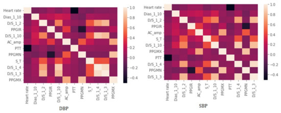 To perform feature selection and optimization, the most common and popular choice is the use of Pearson’s correlation coefficient. It results in a very accurate correlation whenever the features are linear or very close to being linearly related. However, when variables are nonlinearly related, Pearson’s correlation coefficient is calculated using linear approximation between such variables. Based on how nonlinear the relation is, the Pearson coefficient may or may not provide an accurate correlation value. If from beforehand it is known that the relation among some of the features is highly nonlinear, Pearson’s coefficient may provide the wrong feature selection [66]. This could impact the accuracy of the BP measurements. A potential solution would be to calculate the correlation to measure independence between features irrespective of their linear or nonlinear relationship. The relationship among physiological measurements, such as the heart’s electrical activity, pulse wave, and blood circulation through arteries, etc., are highly nonlinear [67,68,69]. For example, blood pressure and artery diameter or stiffness are related in a strong nonlinear manner and any sort of linear approximation would result in a much smaller correlation value compared to their existing nonlinear relation between feature and target variable [67]. The nonlinear dependencies decrease the chance of reducing the dataset dimensions since linear techniques or linear approximation may fail to sufficiently identify them [70]. In addition, extreme outliers or skewed distribution of data, which are common in physiological datasets, may negatively impact the performance of linear methods [70]. In contrast to the only linear model, the nonlinear models based on both linear and nonlinear dependencies show better feature selection performance with more stability and are less affected by including or excluding variables from the dataset [71,72]. For example, research was done by extending the linear correlation to an alpha-grade monomial relation who maximizes the correlation based on changing the value of alpha to which type of nonlinear relationship data exhibit [71]. Their study proved that the proposed alpha-grade correlation coefficient overcame the common drawback of statistical measure that evaluates the significance of relationship between two variables based on their linearity. These studies have provided the basis for the potential improvement of feature selection techniques for physiological data. The expectation is it will solve all aforementioned shortcomings by considering the correlation between both linearly and nonlinearly related features from vital signs, getting rid of bias towards high cardinality features and allowing total correlation in place of only pairwise.