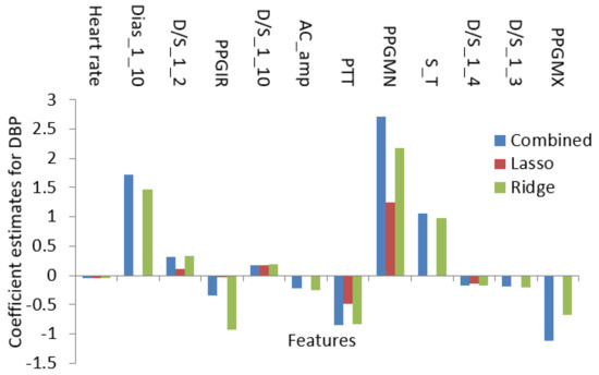 In this section, the necessity of regularization in regression technique will be discussed along with the lasso, ridge, and combined effect of those two regression techniques. Since the result of the techniques discussed in the previous subsection was to optimize the number of features, this subsection will discuss the regularized regression technique which will be implemented using those features to get a cuffless measurement method of blood pressure. The basic linear regression model predicts n observations of target variable Y using the linear combination of m predictor variable X. If the error term is normally distributed with variation σ2: