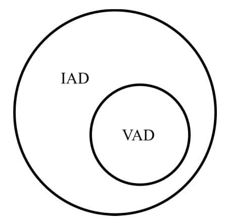Diagram showing the relationship between intracranial artery dissection (IAD) and vertebral artery dissection (VAD).