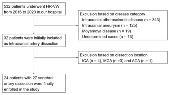 Flow diagram of the patient cohorts for assessment of intracranial vertebral artery dissection. Abbreviations: HR-VWI, high-resolution vessel wall imaging; ICA, internal carotid artery; MCA, middle cerebral artery; ACA, anterior cerebral artery.