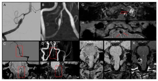 Radiographic features of vertebral artery dissection. (A,B) Fusiform dilatation in DSA and MRA. (C–F) Stenosis with dilatation called a string of pearls signs in DSA and HR-VWI. (G,H) Double-lumen sign in HR-VWI. (I–K) Dissecting aneurysm in HR-VWI. Abbreviations: DSA, digital subtraction angiography; MRA, magnetic resonance angiography; HR-VWI, high-resolution vessel wall imaging.