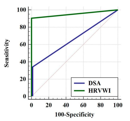 ROC curve for high-resolution vessel wall imaging (HR-VWI) and digital subtraction angiography (DSA). The area under the receiver operating characteristic curve is 0.95 (95% CI = 0.87–1.00) for HR-VWI and 0.67 (95% CI = 0.45–0.88) for DSA. (CI; confidence interval).