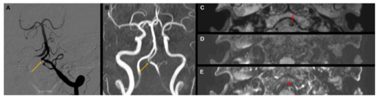 MRI was independently reviewed by a neuroradiologist (K.M.L. with 10 years of experience in the neuroradiologic field) and a neurointerventionalist (J.R. with 7 years of experience in vascular neurosurgery and the neurointervention field). Both reviewers were blinded to the patients’ clinical information and angiographic information. The reviewers focused on the abnormal features on intracranial TOF-MRA, including the MIP image and MRA source image, before performing an analysis focusing on HR-VWI as the following findings: (1) fusiform dilation, (2) pearl–string sign or string sign, (3) intimal flap or double-lumen sign, and (4) intramural hematoma (IMH) or dissecting aneurysm [23,24,26] (Figure 3).