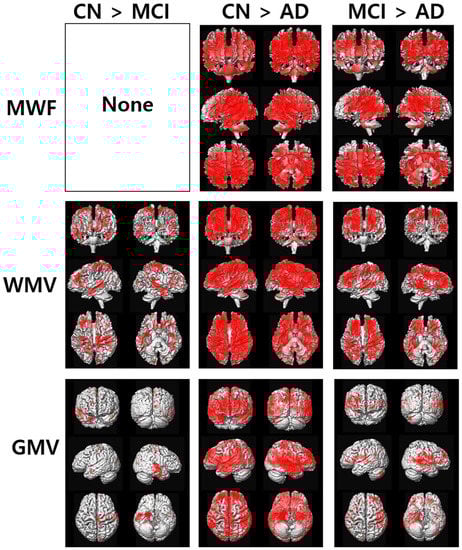 Results of voxel-based ANCOVA analysis of the maps of the apparent myelin water fraction (MWF), gray matter volume (GMV), and white matter volume (WMV) in the three participant groups of cognitively normal (CN) elderly individuals, participants with mild cognitive impairment (MCI), and patients with Alzheimer’s disease (AD).