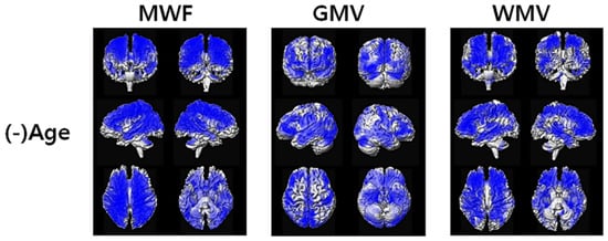 The significant negative associations between the MRI measures and age are shown in blue color.