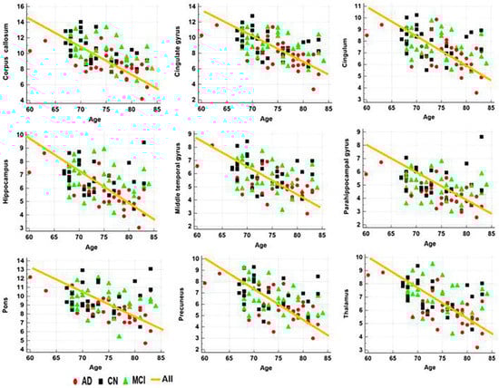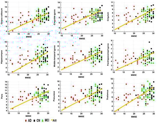 The ROIs were defined in the areas of the corpus callosum, cingulate gyrus, cingulum, hippocampus, middle temporal gyrus, parahippocampal gyrus, pons, precuneus, and thalamus based on the results of the voxel-based analysis and based on the knowledge of the affected locations in AD patients. The atlas-based ROIs were defined using wfu_pickatlas software (http://fmri.wfubmc.edu/software/PickAtlas (accessed on 7 September 2021)). The apparent MWF, GMV, and WMV values were extracted from the selected ROIs.