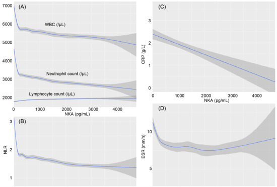 The smoothing splines were drawn using generalized additive models (Figure 1). As NKA reduces to a very low level, less than about 250 pg/mL, the WBC and neutrophil counts increase sharply, and the lymphocyte count exhibits slow decline. Accordingly, as NKA reduces, NLR also increases sharply. Simultaneously, CRP and ESR also increase with a decrease in NKA. In contrast, WBC and NLR decrease in a mild slope with increasing NKA larger than about 500 pg/mL.
