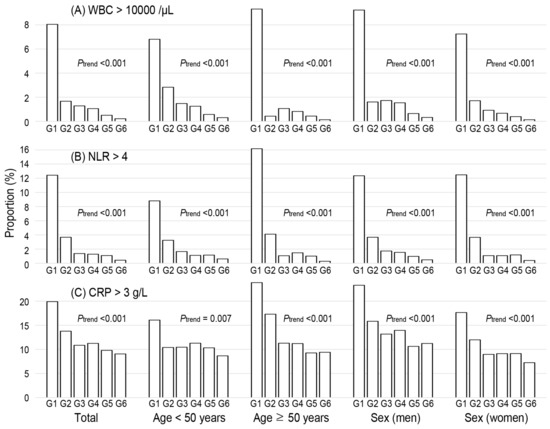 The proportion of high level of inflammatory markers according to the classification of baseline natural killer cell activity. G1–6 represents natural killer cell activity classification (G1, <100; G2, 100–250; G3, 250–500; G4, 500–1000; G5, 1000–2000; G6, ≥2000). The high level of inflammatory markers are defined as (A) white blood cell more than 10,000/μL, (B) neutrophil-to-lymphocyte ratio more than 4, and (C) C-reactive protein more than 3 g/L. p for trend was estimated using Cochran–Armitage tests. WBC, white blood cell; NLR, neutrophil-to-lymphocyte ratio, CRP, C-reactive protein.