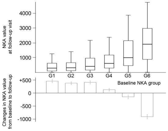 Among 1005 subjects with repeated measurements, the follow-up NKA was increased with advancing baseline NKA groups (Figure 3). However, in three groups with low NKA, the NKA changes were positive (431.4, 400.0, and 414.6 in groups 1–3, respectively). In contrast, the NKA changes in groups 5 and 6 were −114.8 and −897.8, respectively.