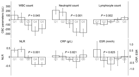 The changes in inflammatory markers according to the quintile of changes in natural killer cell activity. Each bar shows means and error bars express standard errors of means. p values were calculated using ANOVA tests. CBC, complete blood count; WBC, white blood cell; NLR, neutrophil-to-lymphocyte ratio, CRP, C-reactive protein; ESR, erythrocyte sedimentation rate.