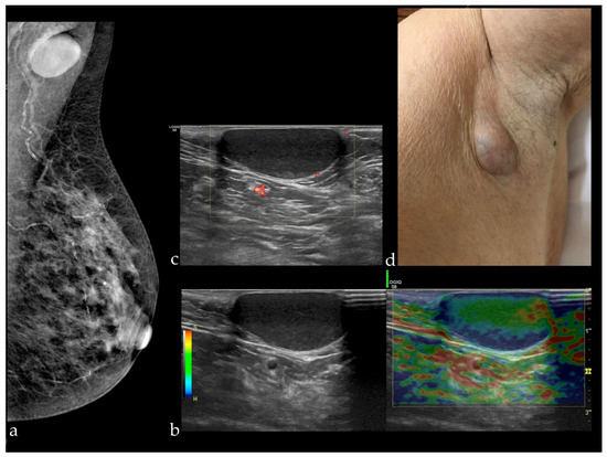 (a) Mammography of the left breast in MLO view presenting a circumscribed mass in the left axilla; HHUS revealing a circumscribed cutaneous cystic lesion, soft at elastography (b) and non-vascularized (there are visible only some vessels in the surrounding tissue) (c), which appeared as a bulging mass at clinical examination (d).