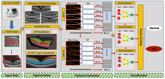 In this study, we tested our developed CAD system using 188 3D-OCT volume. The dataset consists of 100 healthy OCT scans and 88 DR Scans. Zeiss Cirrus HD-OCT 5000 [33] was used to collect the OCT data to do different experiments, which were acquired at the University of Louisville hospital. All patients were informed of the study’s purpose and provided their consent after approval of the research protocol by the University Institutional Review Board (IRB). For each OCT volume, we acquired for each eye (right or left) 5 OCT image scans. The dimensions for each collected volume that were utilized in this paper is 1024 × 1024 × 5 voxels, 8.80 × 1.96 × 500.00 mm, and 9.01 × 2.00 × 2.50 mm. The range of the ages were from 21 to 84 years. The medical retina specialists performed manual segmentation. Two specialists reviewed every image and came to an agreement on segmentation for each image, thus minimizing the risk of human error. There were twelve distinct layers in three-dimensional surface volumes separated by 13 boundary lines. An OCT scan of the macula was conducted in every eye on all diabetic subjects regardless of ocular history in a clinical setting. The scan had a minimum signal strength of . Physicians with sub-specialization in retinal disease determined the degree of disease and the clinical grade of the patient. Each eye was examined with dilated fundus examinations to determine whether there was significant retinopathy.