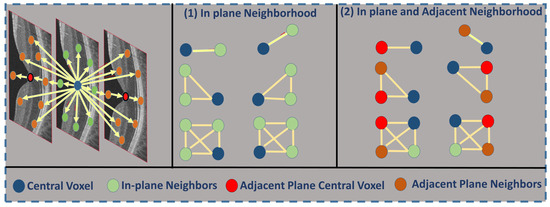 The second stage in our developed method ascertains the higher-order reflectivity feature from the segmented retina layers. Each B-scan in the OCT volume is modeled as one instance of the MGRF in order to model the second-order structure of gray levels in images. An algorithm is used to generate random fields based on interactions among pixels within a fully connected neighborhood, or clique (see Figure 4). Our proposed method utilizes a eight-neighbors translation-invariant system for the 3D-MGRF, .