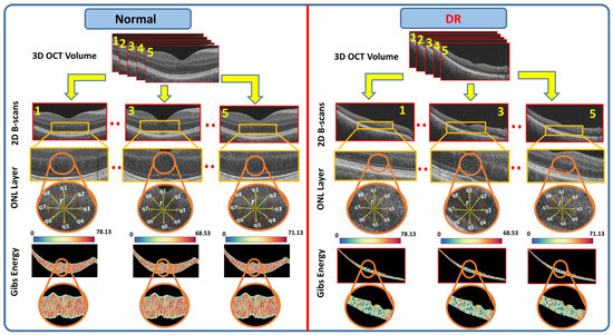 A comparison of the healthy case and DR case at the ONL layer is illustrated with the possible values of the estimated Gibbs energy in Figure 5. At the end, to comprehensively describe each layer’s Gibbs energy values, a CDF is constructed for the nine deciles and a vector descriptor is created (Algorithm 2).