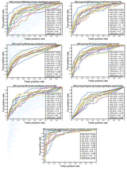 Furthermore, to demonstrate the reliability of the developed system, the receiver operating characteristics (ROC) for each layer is constructed. Figure 6 shows the ROC curves for all 12 layers’ classifications using the 10-fold cross-validation for the proposed system against the other machine leaning techniques. According to the calculated AUC for all retina layer using 10-fold cross-validation, our proposed system shows the highest values for all layers when we compared with the other ML techniques (i.e., SVM with linear and radial basis function (rbf) kernel, logistic regression (LR), Naive Bayes (NB), KNN, random forest (RF), and decision tree (DT)). Moreover, the AUC values of the proposed system for all retina layers gave , , , , , , , , , , , and for NFL, GCL, IPL, INL, OPL, ONL, ELM, MZ, EZ, OPR, IZ, and RPE, respectively.