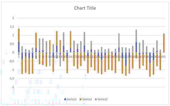 We extracted the brain regions from an atlas, presented in the previous section, and implemented them in each modality. Following this, we conducted a Mass Multivariate Analysis. This resulted in the definition of 119 regions with a calculated p value, chi-square value, and canonical vectors. Canonical vectors refer to the three modalities—CV 1 to the functional MRI data, CV 2 to the resting-state fMRI data, CV 3 to the structural MRI data. In Table 2, we present 44 regions out of 119 with a range of p < 0.01–p < 0.05. Moreover, in Figure 1, the Chi-statistics between the tested groups is presented.