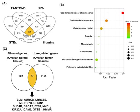 Identification and functional characterization of DEGs in OC. (A) Four datasets (FANTOM5, HPA, GTEx, and Illumina Body Map) were used to identify silenced genes in normal ovarian tissues, and the 335 overlap genes were marked by yellow in the middle; (B) 335 silenced genes from normal ovarian tissues (left) and 6164 up-regulated genes in OC tissues from TCGA-OV dataset (right); the 13 overlap genes were marked by yellow in the middle. These 13 common genes (DEGs) are silenced in normal ovarian tissues but up-regulated in OC tissues; (C) scatter plot of enriched GO pathway statistics. Rich factor is the ratio of the DEGs number to the total gene numbers in a certain pathway. The color and size of the dots represent the range of p-value (hypergeometric test and Benjamini–Hochberg methods) and the number of DEGs mapped to the indicated pathways. Top 10 enriched pathways are showed in the figure.