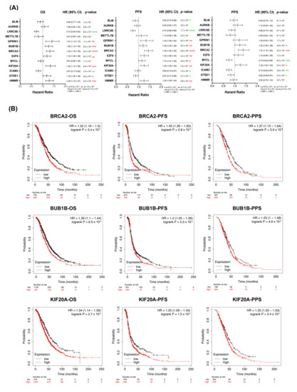 We then used the Kaplan–Meier Plotter to analyze the prognostic values of the 13 DEGs in OC cells. As shown in Figure 2A and in the Supplementary Figure S1, the up-regulated expression levels of each BUB1B, BRCA2, and KIF20A was correlated with worse overall survival (OS), post-free survival (PFS), and post-progression survival (PPS). Overexpressed GPRIN1, E2F8, and HMMR, respectively, were correlated with worse OS and PFS but not PPS. Overexpressed GTSE1 was significantly associated with an unfavorable PFS. No significance was observed between clinical outcomes with high expression levels of METTL7B and AURKB. OCs overexpressing LRRC8E, MYCL, and ICAM3 had better clinical outcomes. Besides, high expression of BLM was correlated with a better PFS.
