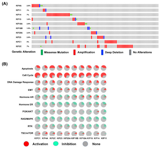 Genetic alterations and cancer-related pathways of ten overexpressed mitotic KIFs in OC. (A) Genetic alterations of ten overexpressed mitotic KIFs in OC (cBioPortal). Genetic mutation events include missense mutation, amplification, and deep deletion. KIF14 and KIF2C rank the relatively highest two genes of genetic alterations, and their mutation rates are both 7%; (B) the roles of ten overexpressed mitotic KIFs in the famous cancer-related pathways (GSCALite). The red, turquoise, and grey parts present activation, inhibition, and none, respectively.