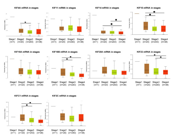 Transcription profiles of ten overexpressed mitotic KIFs in OC clinicopathological subgroup analysis (UALCAN). Sample numbers of each stage: stage 1 (n = 1); stage 2 (n = 20); stage 3 (n = 243); and stage 4 (n = 38). * p < 0.05.