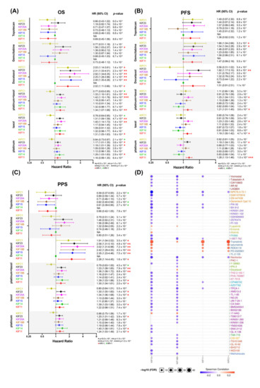 Prognostic values of ten overexpressed mitotic KIFs in OC chemotherapies. Forest plots of relationship between prognosis (A) OS, (B) PFS, (C) PPS, and ten overexpressed mitotic KIFs mRNA expression in patients with different OC chemotherapies using TCGA-OV dataset. (D) Drug resistance analyses of overexpressed mitotic KIFs. The expression of each gene was performed by Spearman correlation analysis with the small molecule/drug sensitivity (IC50). The positive correlation means that the gene high expression is resistant to the drug and vice versa.