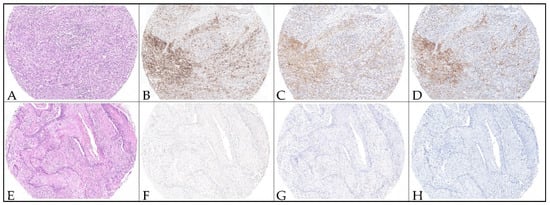 Representative micrographs of PD-L1 immunohistochemistry staining with different assays on TMA cores from head and neck squamous cell carcinoma. Hematoxylin and eosin-stained cores (A,E) with positive and negative PD-L1 expression. TMA cores from a case showing high CPS score values (CPS > 1) using the 22C3 pharmDx assay on Autostainer Link48 platform (B), 22C3 assay on Omnis platform (C), and SP263 assay (D). TMA cores from a case showing negative CPS score value (CPS < 1) using the 22C3 pharmDx assay on Autostainer Link48 platform (F), 22C3 assay on Omnis platform (G), and SP263 assay (H). Original magnification 100×.