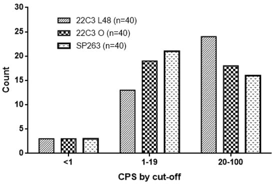 When we considered the cut-off of ≥1, 37 cases (92.5%) had a positive CPS score with both 22C3 pharmaDx tests and SP263 assays. CPS values between 1 and 20 were scored respectively in 13/40 (32.5%) cases with 22C3-Autostainer, in 19/40 (47.5%) cases with 22C3-Omnis and in 21/40 (52.5%) cases with SP263 assay. CPS values ≥ 20 were diagnosed in 24 out of 40 (60%) cases with 22C3 -Autostainer, in 18 out of 40 (45%) cases with 22C3-Omnis and in 16 out of 40 (40%) cases with SP263 assay (Table 1). Three samples (7.5%) had a CPS < 1 in all cores with both assays on the three platforms. The distribution of CPS is shown in Figure 2.