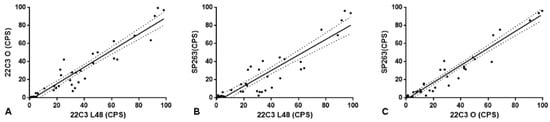 (A): the figure shows the direct and significant correlation between CPS evaluated with 22C3 pharmaDx on Dako Autostainer link48 and Dako Omnis (O; Spearman r = 0.900 p < 0.0001). (B): the figure shows the direct and significant correlation between CPS evaluated with 22C3 pharmaDx on Dako Autostainer link48 and SP263 assay (Spearman r = 0.893 p < 0.0001). (C): the figure shows the direct and significant correlation between CPS evaluated with 22C3 pharmaDx on Dako Omnis (O) and SP263 assay (Spearman r = 0.935; p < 0.0001).