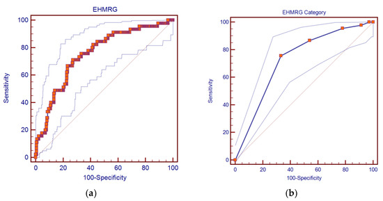 ROC curves of: (a) EHMRG score, considered as a continuous variable (AUC: 0.753; 95%CI: 0.710–0.793; p < 0.0001); (b) EHMRG score, considered as a categorical variable (AUC: 0.727; 95%CI: 0.683–0.768; p < 0.0001).