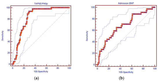 ROC curves of: (a) TAPSE/PASp, considered as a continuous variable (AUC: 0.831; 95%CI: 0.782–0.872; p < 0.0001); (b) admission BNP, considered as a continuous variable (AUC: 0.667; 95%CI: 0.624–0.706; p < 0.0001).