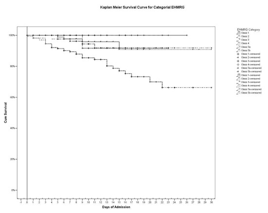 In the timeframe between 1 January 2018 and 30 December 2019, we retrospectively assessed all the consecutive patients evaluated in the ED of INRCA-IRCSS Hospital (Osimo, Ancona, Italy) and subsequently admitted with an AHF diagnosis to the Internal Medicine department of the same hospital. The INRCA-IRCSS (National Institute for Care and Research in Ageing) Hospital of Osimo (Ancona, Italy) is fully dedicated to the care and research of geriatric diseases, and it is specialized in acute care of elderly patients. Regarding AHF, the ED of the structure has a direct access to the Internal Medicine department. Patients affected AHF associated to other acute illnesses, as for example acute coronary syndromes (both STE and NSTE) requiring urgent revascularization, arrhythmias requiring pacing, acute valvular diseases or cardiac diseases requiring cardiac surgery, or associated critical illnesses requiring intensive care unit admission (i.e., pulmonary embolism, septic or cardiogenic shock) are directly sent or to the INRCA cardiac care unit or to a larger tertiary-care hospital after pre-hospital or ED evaluation. Thus, “very-high risk” clinical conditions were not present in the enrolled cohort, which comprised mostly patients affected by acutely decompensated heart failure (ADHF) or de novo AHF due to medical conditions (arrhythmias, hypertensive crises, and other causes). The diagnosis of ADHF/AHF was given by the attending physician according to the ESC 2016 guidelines that were current at the moment of the study [17]. For each enrolled subject, we collected the following data: age, sex, days of admission, BNP values at admission (pg/mL), and NYHA class. At ED arrival, we calculated, for each subject, the EHMRG score by assessing the necessary items: arrival by ambulance, systolic blood pressure (SBP), heart rate (HR), oxygen saturation (SpO2), serum potassium levels, serum creatinine levels, serum troponin levels, presence of active cancer, and metolazone use. We then calculated the absolute EHMRG score, according to its original definition, as synthesized in Table 1; then we categorized the patients into the six EHMRG quintile categories (Class 1: −49.1; Class 2: from −49.0 to −15.9; Class 3: from −15.8 to 17.9; Class 4: from 18.0 to 56.5; Class 5a: from 56.6 to 89.3; Class 5b: 89.4) [11].