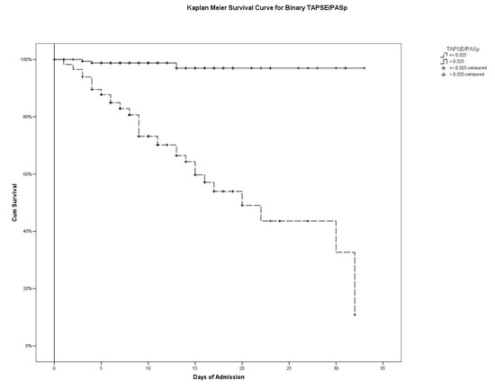 Kaplan–Meier curve of TAPSE/PASp, considered as a dichotomous variable (p = 0.0001, log-rank test).