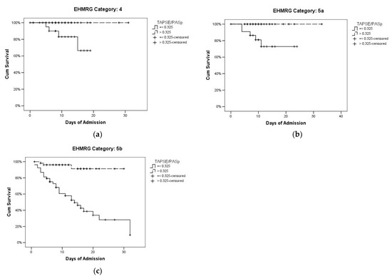 Kaplan–Meier’s curves of survival for TAPSE/PASp in (a) EHMRG category 4 (p = 0.010, log-rank test); (b) EHMRG category 5a (p = 0.010, log-rank test), (c) EHMRG category 5b (p < 0.0001, log-rank test).