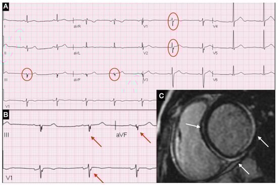 This was a monocentric, retrospective study involving the ED of Papa Giovanni XXIII in Bergamo, Italy, a tertiary hospital with over 90,000 visits/year. Patients admitted between January 2016 and March 2021 with a proven diagnosis of AM, according to clinical, CMR and/or histologic criteria, were retrospectively analyzed. Clinical variables recorded at baseline were: 12-leads ECG, echocardiography and laboratory findings. Hospital records of admitted patients were also retrieved in order to assess the association of initial presence vs. absence of fQRS with the ascertainment of AM diagnosis. As previously published, fQRS was defined as the presence of an additional R wave (R’) or notching in the nadir of the S wave or the presence of >1 R’ in at least 2 contiguous leads [21,22].