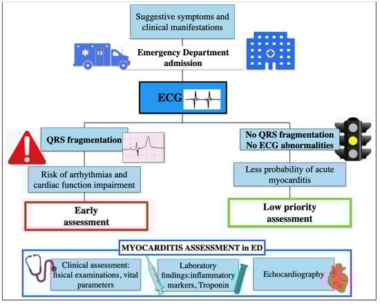 In this study, we observed that systematic search of fQRS in the first ECG recorded in the ED may be useful for the early triage of patients with suspected myocarditis (Figure 2).