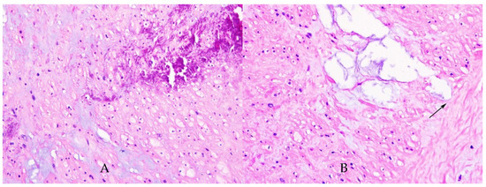 Haematoxylin-eosin coloration. (A) High-power view of the artery with medial calcification and myxoid degeneration. HE, ×400. (B) High-power view of the medial myxoid degeneration. Notice the cystic spaces which encounter external elastic lamina (arrow); HE, ×400.