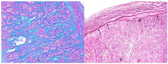 (A) AB-PAS stain highlights acid mucins (blue stain) within the entire wall of the artery; ×200. (B) Elastica van Gieson stain highlights the internal elastic lamina (arrows) which is focally interrupted (arrowhead), ×100.