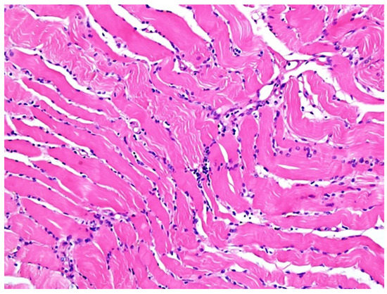 Haematoxylin-eosin coloration. Microscopic features of skeletal muscle inflammation; interstitial aggregates of lymphocytes and macrophages can be noticed; HE, ×200.