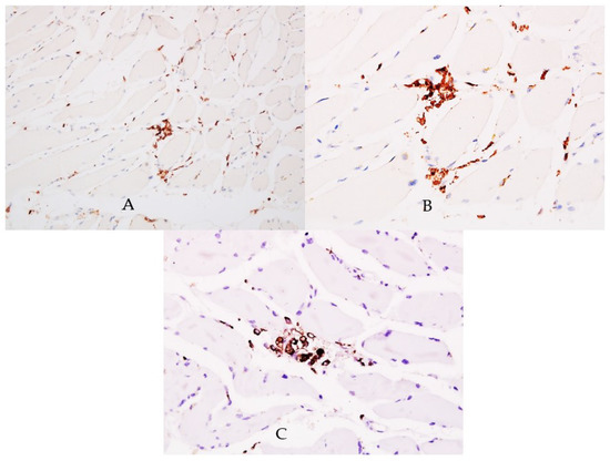 CD45 reaction. (A) Lymphocytes within muscle interstitium are highlighted by CD45 positive reaction, ×200. (B) High-power view of the interstitial lymphocytic infiltrate, positive for CD45, ×400. (C) Aggregates of macrophages positive for CD68 were noticed within the skeletal muscle interstitium, ×400.