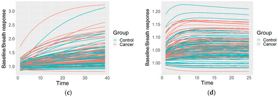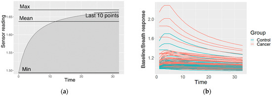 Before the sensor response curves were processed, measurements that lacked some of the sensor readings owing to technical problems were excluded from the analysis (ten gastric cancer patient and two control group measurements). Then, the measurements (one time series per sensor) were preprocessed by equalizing the measurement lengths (some sensors had extra time points at the beginning or end of the measurement because of the measurement specifics) such that they could be analyzed using methods that require equal-length time series. The readings were normalized against the final values of the baseline measurements (the room air measurements before the breath analysis) when the sensor response had stabilized in order to remove the effects of the environmental air and the VOCs present in it. All of the measurements were also examined in order to identify outliers by projecting the observations to the principal components, calculating orthogonal and score distances, and evaluating them as proposed by Rodionova and Pomerantsev [27]. The median filter was applied to reduce any noise in the sensor readings.