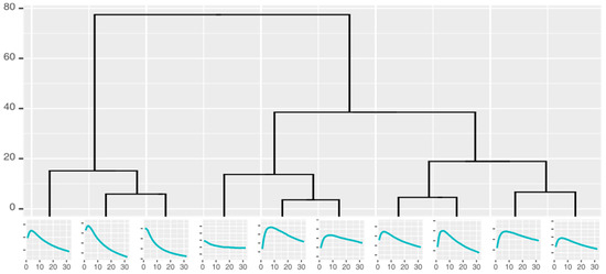 Curve shape taxonomies holding the curves that can potentially be used for classification were built by repeatedly clustering the measurement curves into k similar groups and identifying the characteristic shape of each cluster. The number of the groups could not be defined precisely before the analysis; as such, we used hierarchical clustering and cuts in the resulting dendrograms to generate 2–10 clusters, all of which were used to create a hierarchical taxonomy (Figure 4) of the groups (represented by the characteristic curves).
